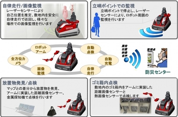 今回の実証実験では、セコムロボットX2が、巡回監視ルートを自律走行し、アームに搭載された距離画像センサーと熱画像センサー、金属探知機により、不審な放置物やゴミ箱内の点検を行う。また巡回後は定められた立哨ポイントで停止し、周囲の監視を行う。