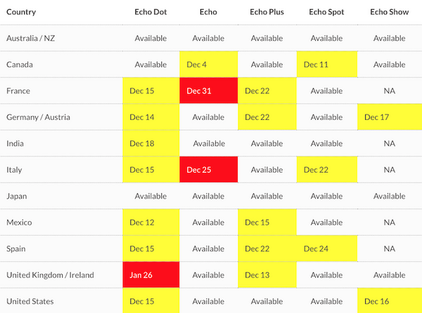 ホリデーシーズンのセールでAmazon Echoが急激に販売を伸ばしている。その結果、一部の国でEchoが売り切れている状況になっている。国ごとのEchoファミリー機種別の納期状況をVoicebot.aiがまとめているので簡単に紹介したい。