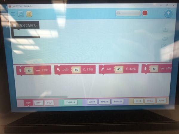 まずはプログラミングを学びます。自分の「プロロ」とコンピュータを接続。上記画像の「プログラムかいし」の下にブロックを置いていくことによって簡単にプログラムを組むことができます。講師のお姉さんから「前方に10cm進ませてください」と指示があったため、「10cm、すすむ」のブロックを、「プログラムかいし」の下に置きました。これで、「プロロ」を簡単に動かすことができました。