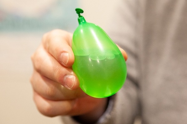 風船が2つ用意されている。緑の風船の中には水が入っているが、赤い風船には入っていない。緑の風船を揺らすと当然、中の水の動きを感じることができる。
