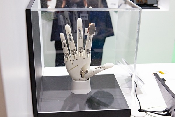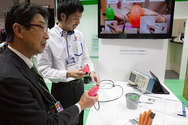 e-Rubberは絆創膏のように薄く、指先につけることで、触覚を感じるセンサーにも、触覚を伝えるアクチュエータにもなる。展示ブースではセンシングの体験ができるコーナーもあり、ロボットハンドへの応用のイメージも展示されている。