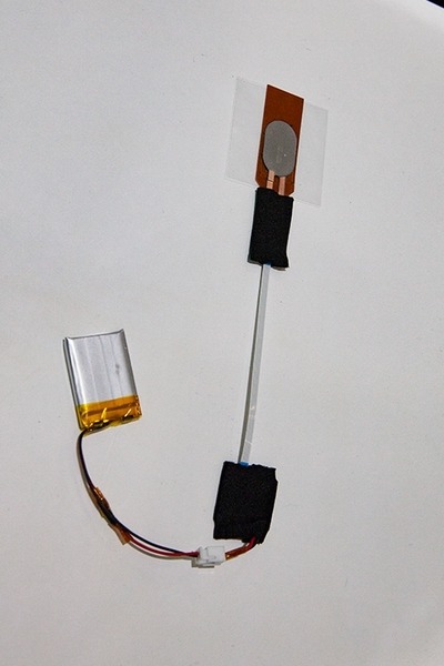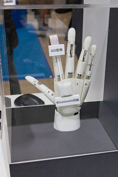 グローブやロボットハンドへの応用では、既にBluetoothでのモバイル実験が行われていて、指先につけた模型や実働のセンサーセットが体験できる。