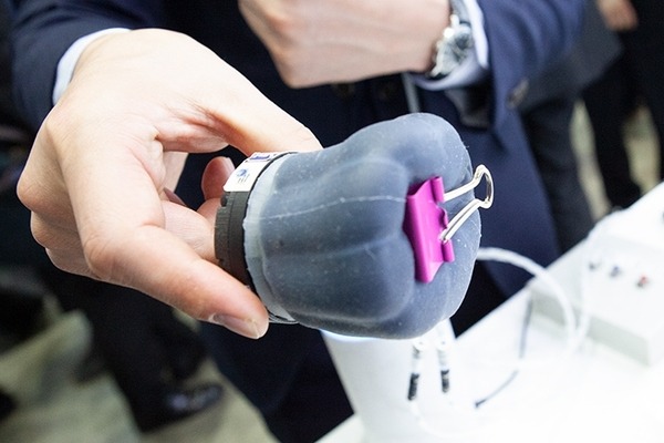 つかむ部分はブヨブヨしている。それなのにデモを見ると、消しゴム、クリップ、付箋紙を掴んだりできる。バキューム式かとおもいきや、刃物のように尖ったものでもつかめるそうだ。しくみは「摩擦」を使っているというが、それを聞いてもどうして掴めちゃうのかさっぱりわからない。