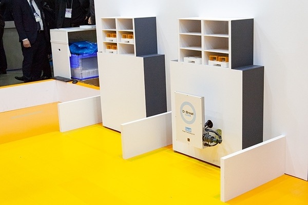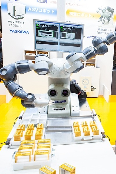 1台のロボットは「AGVロボット」。安川電機のロボットアームをAGV(自動運搬車)に乗せたもの。知能化された移動型ロボットを実現する「WISEロボットコントローラ」がロボットアームとAGVに挟み込まれるように搭載されている。