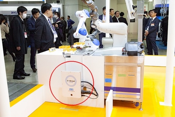 もうひとつはワイアレス給電を行っていることだ。ダイヘンの「D-Broad CORE」を使って、AGVロボットに給電する。このワイアレス給電システムはAGV用に設計されていて、生産ライン上で給電することができるため、専用の充電スペースを用いる必要がない。手持ちのAGVに後付けすることができ、AGVの24時間稼働を狙ったものだ。デモでも、AGVが停止してロボットアームが作業する箇所に給電装置を設置して作業時に効率的に充電することを目指した。ただし、このデモではAGVのバッテリーは長時間駆動できるため、ロボットアームの作業電源をワイアレス給電装置から供給しているイメージとなっている。