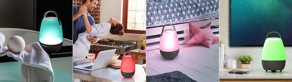 特徴はAlexa搭載スマートスピーカーの機能に追加して、アンビエントライトを搭載している点にある。ランタン風デザインの本体内に1,680万色のアンビエントライトを内蔵しており、ムードやシーンに合わせて好きな色で周囲を照らすことができる。また本体に内蔵された環境音とアンビエントライトを組み合わせたサウンドスパ機能でリラックス効果を得られるという。