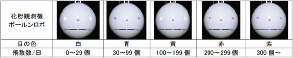 『ポールンロボ』は直径約15cmの球体型花粉観測機。空気中に含まれる花粉をカウントし、観測した花粉量に応じて目の色を「白」「青」「黄」「赤」「紫」の5段階に変化させることで、簡単に花粉の量を知ることが可能。