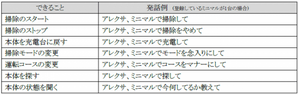 スマホアプリをアップデート後、初期設定をすることで「Amazon Alexa」を搭載したスマートスピーカーなど各種デバイスでの音声操作が可能となる。「アレクサ、ミニマルで掃除して」と話しかけることで、ミニマルが掃除を始めるなど、音声でさまざまな操作ができる。