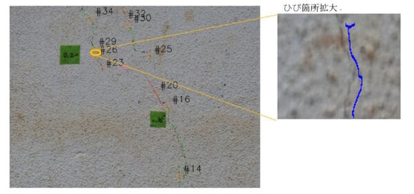3社はすでに、同サービスの実証実験を実施しており、ドローン撮影した建築物の全体画像を3Dモデル化し、AIで自動抽出したひび割れ個所を3Dモデルに重ねた損傷図を作成するシステムを構築、検証を行った。実験結果として、ドローンの撮影画像から一般的なひび割れの許容範囲といわれている0.2mm幅相当のひび割れ箇所の検出ができたそうだ。
