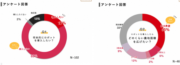 また、プレゼンテーションでは、「ロボット導入を希望する農家が9割以上を占めている」「農地を広げたい方が7割もいる」という調査結果の報告も行った。