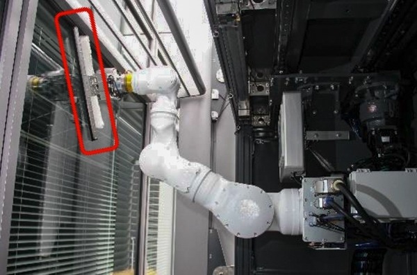超高層ビルにおいてゴンドラによる高所作業を多関節アーム搭載のロボットが外窓清掃を行うもので、同社によれば日本初の試みとなる。人が行う清掃動作を記憶させた作業ロボットが、縦横自在にスクイジー(下の写真:赤色部分)を動かすことが可能で、清掃クオリティの向上が期待できる。