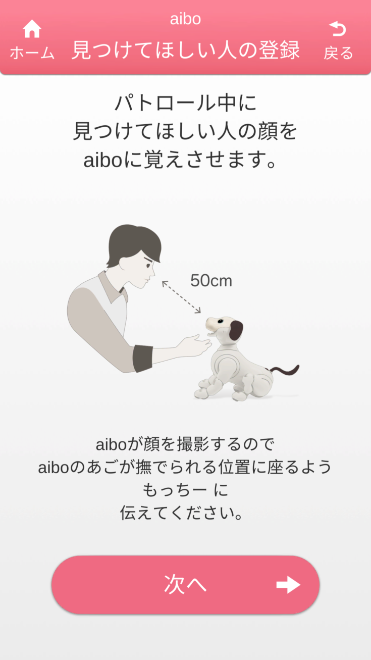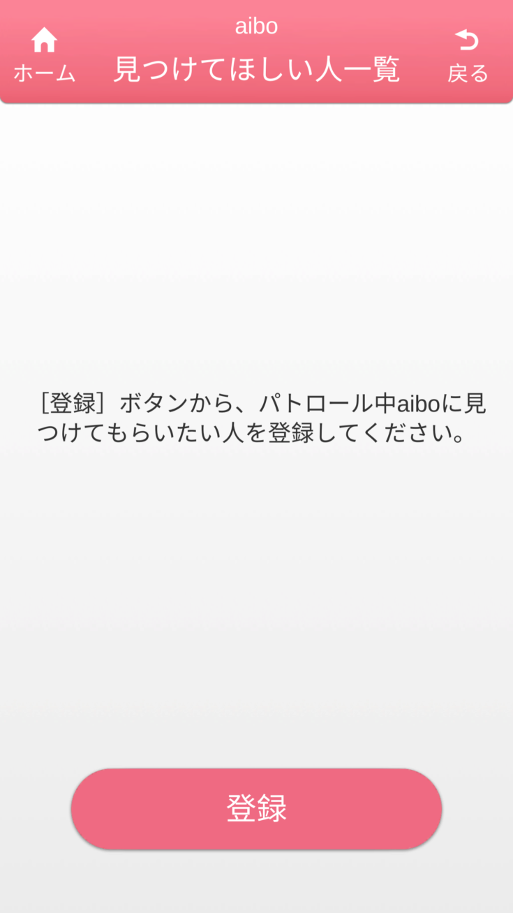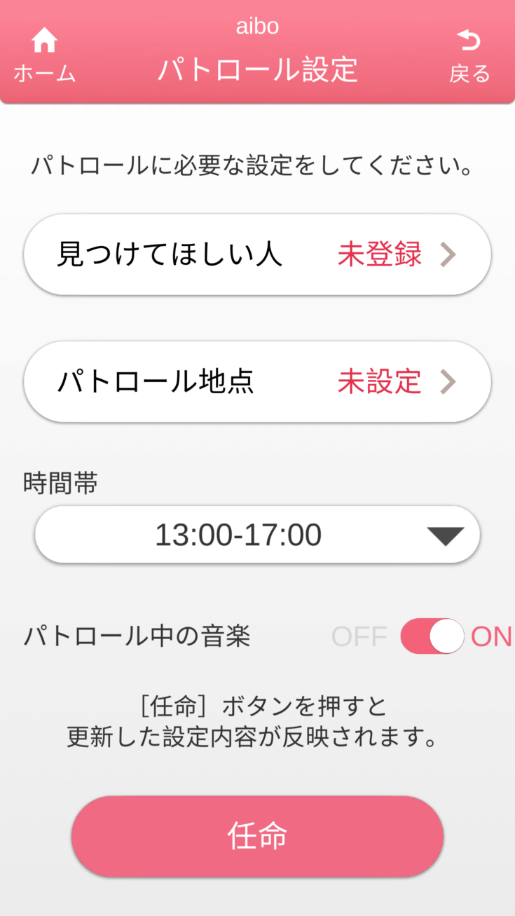 My aiboで、aiboが作った家の地図を見ることができるようになります。その地図の中で、aiboにパトロールしてほしい場所を指定し、名前をつけることができる。予め設定された時間帯になると、aiboは「犬のおまわりさん」のメロディーとともにその場所まで歩いて、「見つけてほしい人」を探し、可愛いふるまいを披露してくれる。