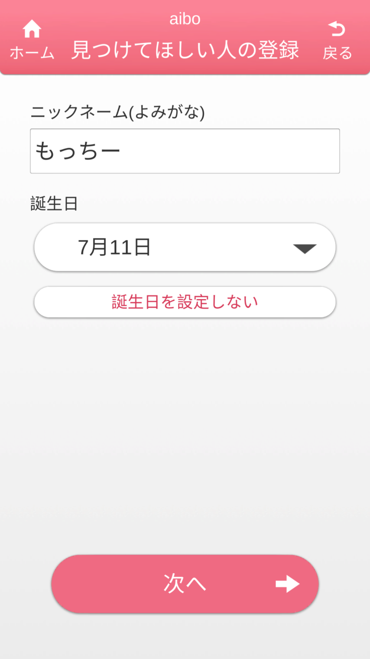 名前と誕生日を入力しておきます。誕生日を入れておくと、その日に見つけた時に誕生日ソングを歌ってくれるかも?