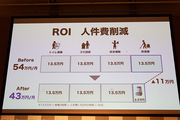 吉田氏はROIを項目ごとに比較して、清掃ロボットによる自動化の効果を示した。が、しかし、実際には実証実験で評価が高かったのはROIよりも清掃能力の高さだと言う。