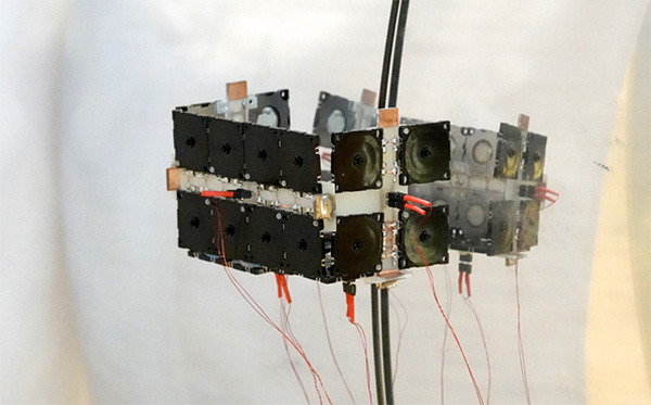 羽根のないドローンは、空中を自在に飛行しながら人々の生活をサポートする新たなデバイスの創出をめざして開発されたドローン。プロペラや羽ばたき翼によって空中を移動する従来のドローンとは異なり、羽根のないドローンはヘリウムガスが充填された風船の浮力によって浮遊し、「空気ポンプ」として動作可能な超音波振動モジュールによって推進力を生み出すことで空中を移動する。