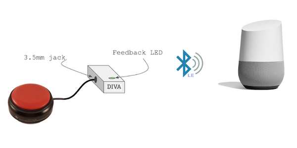 アイディアを実現するために作られたシステムは、大型ボタンとDIVAの箱とGoogle Homeを組み合わせた構成だ。ボタンを押すとDIVAの箱から無線でGoogle Homeを操作できる。Google Assistant Connectチームと協力を得て開発されたという。