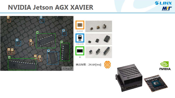 また「Jetson AGX Xavier」でディープラーニング技術を使ったIC検知の例もデモで紹介されました。移動し続けるICをJetsonシリーズでリアルタイム検知します。24.64msで検出可能とのことでした。