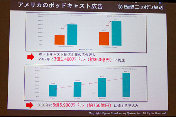 5月31日に開催された「Voice UI Show」でニッポン放送が講演し、音声コンテンツを持っているラジオ局にとってスマートスピーカーはどのような存在で、どう活用しようとしているのか、米国で先行するポッドキャスト広告市場の急激な伸びについても紹介した。