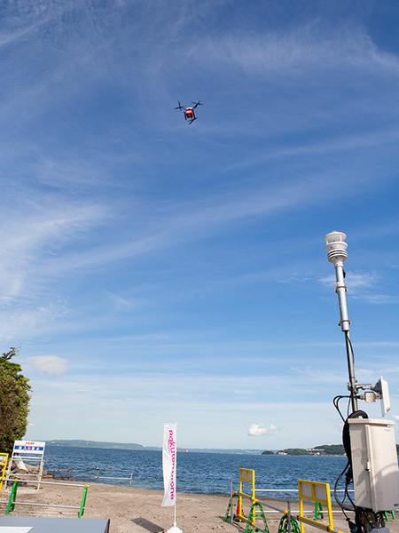 猿島のビーチに設置したドローンポートにみごと着陸する楽天ドローン