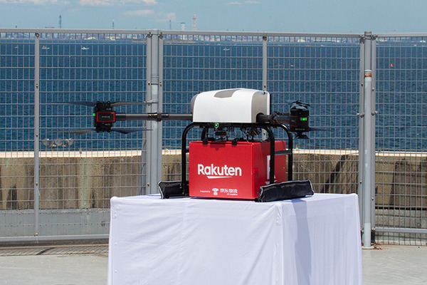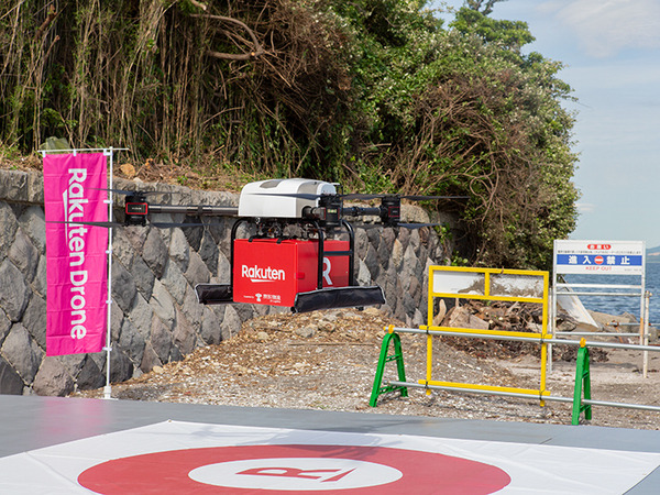 楽天と西友、横須賀市は共同で「離島へのドローン配送発表式典」を開催した。横須賀市の海上に見える「猿島」にいるユーザーからの注文を西友が直接受けて、楽天ドローンで配送するサービスだ。当日は風が強いにもかかわらず、デモ飛行を披露。ドローンは無事に海を渡って猿島のビーチに降り立った。