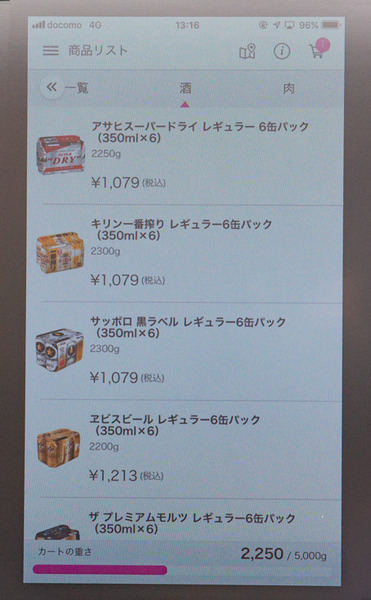 商品として缶ビール6缶パックを注文したところ。画面下に重量が表示される。5kg以下のものしか注文ができない