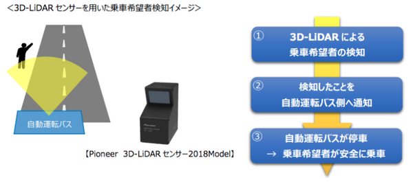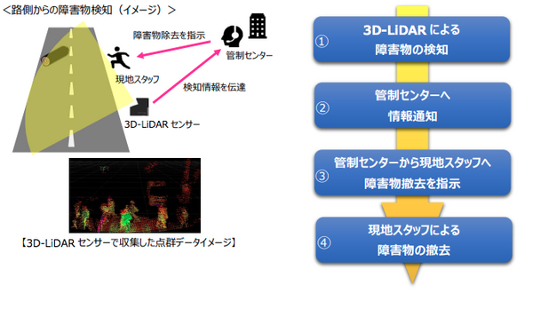 車外環境の検知は、自動運転車両の死角になる道路の路側に3D-LiDARセンサーを設置し、その情報を運行監視センターに通知。もし自動運転車が走行ルート上の樹木などの落下物、その他障害物を検知した場合は、除去するまでの一連の処理を実運用に近い状況で検証し、インフラ側からサービスを支えるための課題抽出を行う。さらに、車両側にも3D-LiDARセンサーを搭載し、走行ルート上の乗車希望者を検知する仕組みも検証するという。