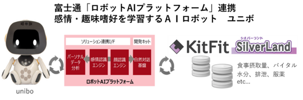 都築電気の介護事業者向けソリューション「KitFit SilverLand」のオプション製品である介護記録システムと、自然な対人コミュニケーションを実現する富士通の「ロボットAIプラットフォーム」および「unibo」を組み合わせることで実現している。8月1日より提供開始予定。