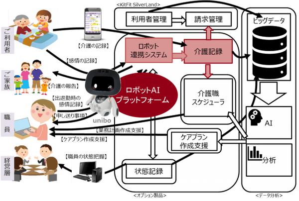 「KitFit Silverland 介護記録システム」は、従来職員が個別に行っていた利用者の家族への介護状況の説明や、職員の交代時の申送り事項の共有、などを介護記録をもとにロボットが担当。さらに、uniboを含む各種デバイスからデータを収集、分析した結果をケアプラン作成支援などの介護業務効率化に利活用することで職員の負担を軽減する。