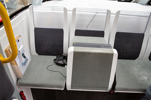 もともとこの車両にはハンドルも運転席もない。しかし、現行の道交法では、運転席や操作するための機器を社内に設置することが義務づけられている。認可を受けてナンバープレートを取得するために、その基準に合致するよう、運転席に相当するシートとゲーム等で使用されるコントローラを設置することでこの課題(自動運転レベル2)をクリアした。