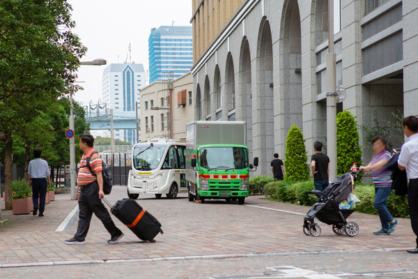 公道なので対向車や歩行者が周囲に通行しているが、歩行者が近付いたときは速度を落として安全を確保していた。途中で配送業者のトラックが路駐して荷下ろしをしていたが、ゆっくりで時間がかかるものの、車線変更してうまくパスしていた。そのほか、低速走行のためタクシーなどが追い越す動作を見せていたが、もちろん事故なく走行実験が行われていた。