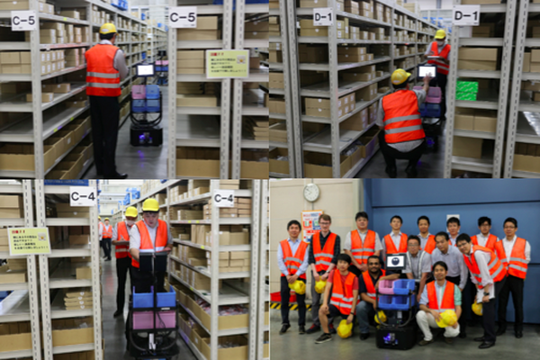 今回の実証実験では、倉庫内のピッキングエリアにおいて人や物に干渉することなく可動するRapyuta Roboticsのロボットを使用。同一の出荷オーダーを用いて、人員のみで作業を行った場合とロボットを併用した場合の、歩数・移動距離・ピッキング終了までの総作業時間等を計測し、比較を行った。