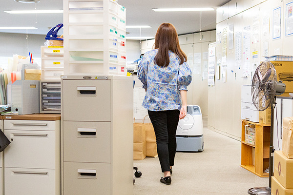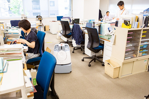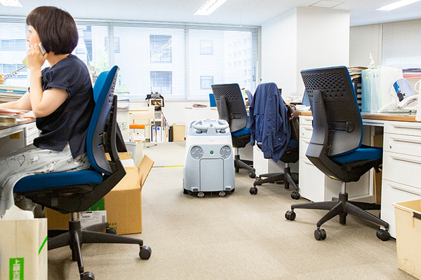 退社時間後とはいえ、オフィスの場合は残業で残っている社員もいます。また、オフィス内の通路には段ボール箱やカバンなどが置かれている場合があるので、Whizの清掃を始める前に清掃員がそれらを机の下にしまって通路をなるべく空けるなど、簡単な準備作業を行ってから始動しています。それでも走行し始めればバキューム清掃を自動で行なってくれるので効率化が図れていると感じています。