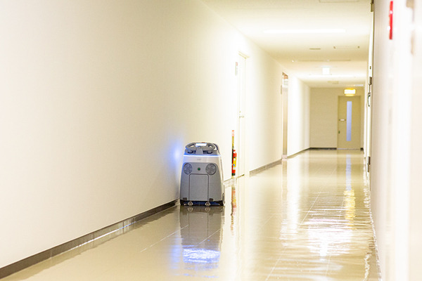 廊下の場合、障害物がほとんどないので緊急停止もほとんどありません。ただ、当ビルの廊下はタイル地なので照明が床に反射します。導入当初はその反射を障害物と誤検知してしまって停止してしまうことがありました。しかし、最近では反射の誤検知もしなくなって順調に清掃を続けられるようになり、「AIが学習しているのかな」と感じています。