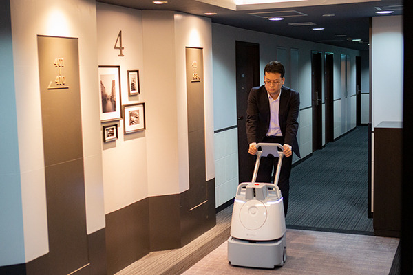 客室内の清掃など、お客様が直接触れる場所はできるだけ人手を使って丁寧に行い、廊下などの共有部分はロボットなどの自動化によって効率化をはかり、深刻化する労働力不足に対応していくことが、人とロボットの協働、共存に繋がると考えています。