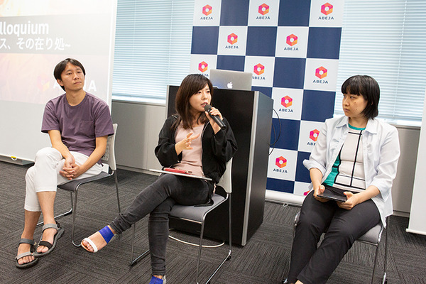 登壇者は東京大学/理化学研究所/日本ディープラーニング協会理事などで活躍中の江間有沙氏、アーティストの長谷川愛氏、ABEJA Labsリサーチャーの白川達也氏の三人。