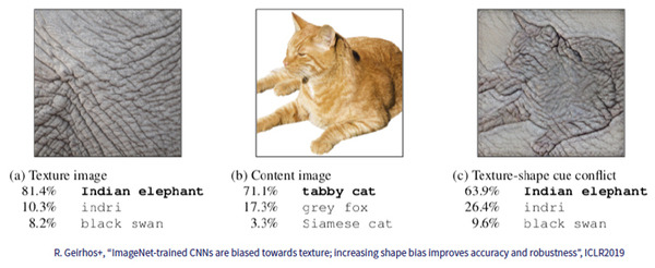 学術研究で標準的に使用される画像認識データセット「ImageNet」のデータを使って学習したDeep Neural Networksは、オブジェクトの形ではなくテクスチャー(素材感)をもとに推論しがちであることが明らかになったと言う。例えば、人間はネコかどうかを「形状」で判別しがちだ。下図の右の画像は像の皮膚のテクスチャー上に描かれた「ネコ」だ。これを「ImageNet」のデータセットで学習したAIは「像」と判定するという。