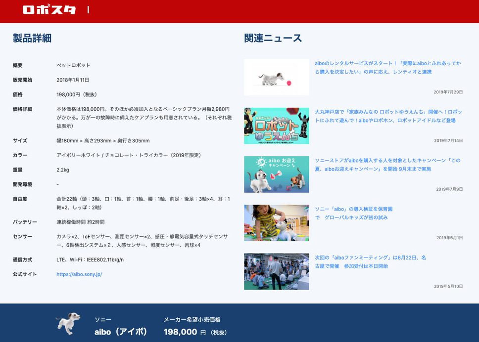 「ロボットデータベース」は、ロボットとAIの最新情報を提供するウェブマガジン「ロボスタ」内のコンテンツのひとつで、無料で利用することができます。2019年8月26日時点で、104種類の製品が登録されています。