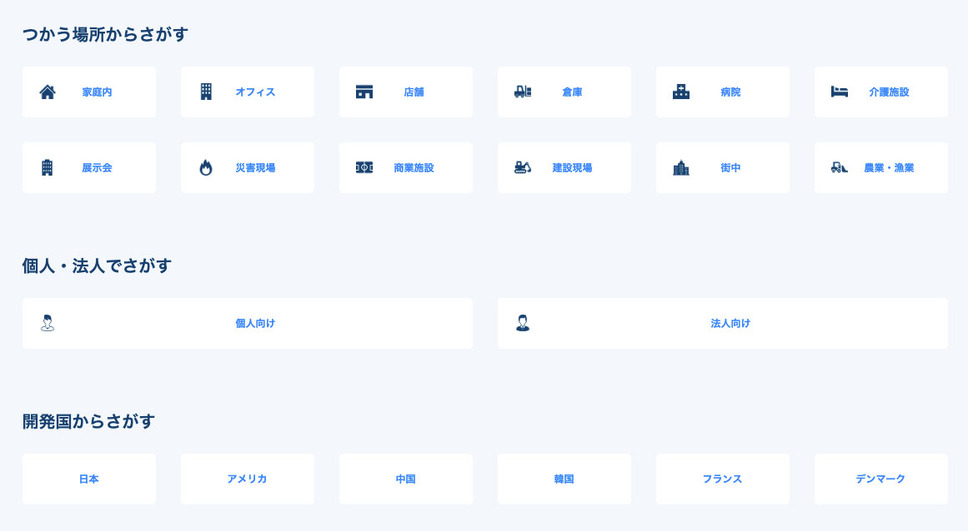 更にこれらのロボットを「家庭内」「オフィス」「店舗」等の「つかう場所からさがす」、更には「開発国からさがす」や「メーカーからさがす」といった各種検索機能も用意しているので、目的のロボット製品の情報まで短時間でたどり着くことができます。