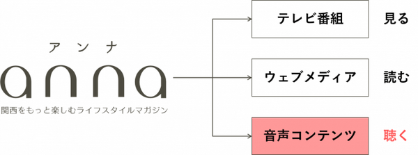 現在の消費者・ユーザーの行動や興味は多様化し、情報の接触方法も同様のことが考えられる。そこでanna(アンナ)では、様々なユーザーへ情報を届ける新たな施策の一環としてポッドキャストやスマートスピーカー上で、音声コンテンツの配信を開始。ウェブの記事で「読む」、地上波番組を「見る」に加え、関西のお役立ち情報を「聴く」ことが可能となる。