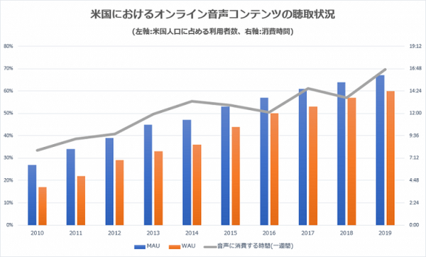 現在アメリカを中心に、ポッドキャストなどのオンライン上の「音声コンテンツ」が注目を浴びている。その背景に、アメリカでの視聴者数は人口の半分以上にも拡大している。