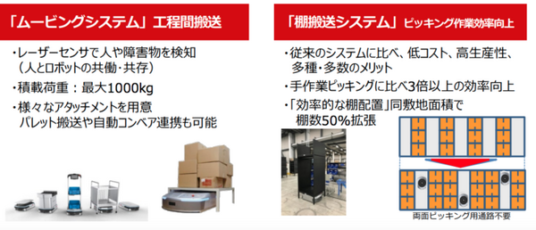 紹介する物流ロボットシステムは、作業担当者のもとへロボットが商品棚を運ぶため、ピッキング作業効率が3倍以上向上、人手不足解消に貢献する「ピッキングシステム」と、人や障害物を検知しながら最大1,000kgを目的地まで搬送する「ムービングシステム」の2種。ムービングシステムは製造工場の工程間搬送にも導入することができる。