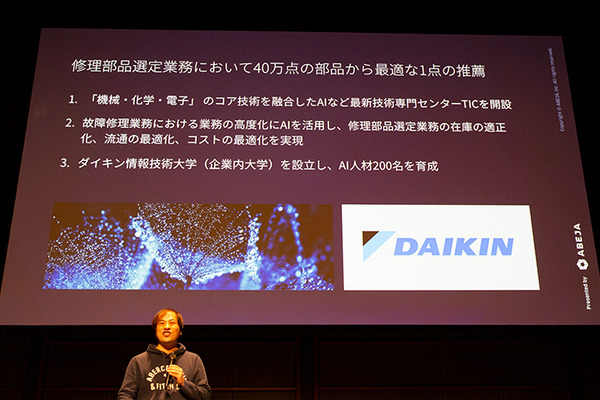 エアコンの部品点数は40万点の中から、故障修理の部品を判別しなければならない。高齢化でベテランが減り、人手不足も進む。それを見越して同社はダイキン情報技術大学を設立、AIがその業務を支援する AI人材を200名を育成しているという(岡田氏も講師をつとめている)。