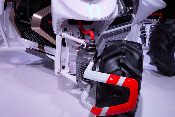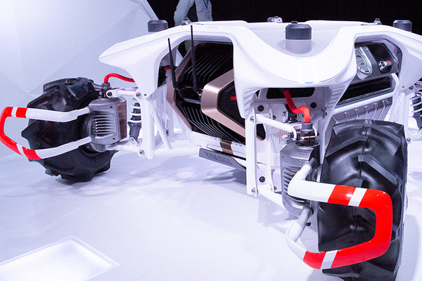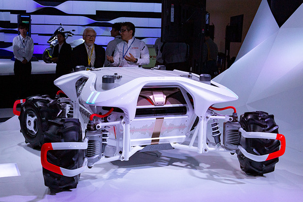 「ランド リンク コンセプト」は4WDと4WS機構を採用しているが、マシンを見ると実はシンプルな話、各タイヤの部分にモーターを装着して、それぞれの車輪を別々に駆動させる手法をとりいれている。