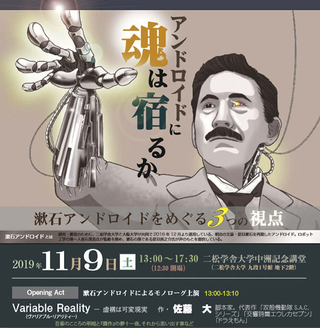 「アンドロイドに魂は宿るか? 漱石アンドロイドをめぐる3つの視点」と題したシンポジウムが、二松学舎大学大学院文学研究科と大阪大学大学院基礎工学研究科との共催により、11月9日に開催された。