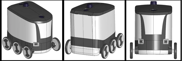 【左】全長730mm、全福569mm、高さ703mmのコンパクトな車体、【中央】背面からの図/今後牽引などが行えるように改良予定、【右】正面からの図/車体最上部にLiDARを設置