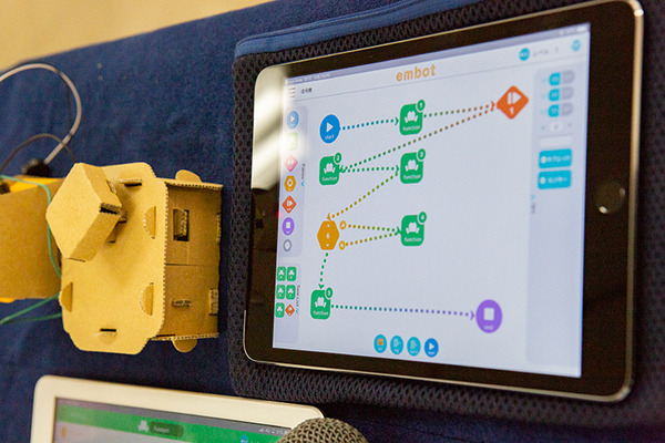 葛飾区では現在、一校あたり約40台の共用タブレットを配布している。プログラミング教育全般について区役所から各校に支援している状況については、今までは主にタブレットで利用できるアプリの配布と推進によってICT力をつけることを支援を発表してきた。今回のembotのプロジェクトでもプログラミングにはタブレットが必要になるが、各校に配布しているものが活用できる。embotのようなロボットキットを採用をするのは今回が初めてとなる。