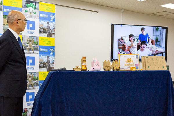 定例記者発表会では、葛飾区区長の青木克徳氏が登壇し、2社との協働事業として小学校等プログラミング教育に「embot」を採用し、配布することを発表した。