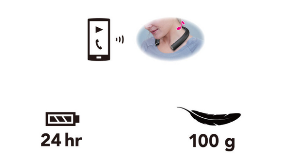 C9wireless neck speakerは耳を塞がないリスニングスタイルのワイヤレススピーカー。周囲の「音」を聞きながら音楽やポッドキャスト、インターネットラジオ、英会話などを楽しむことができる。また長時間装着しても肩や首に負担にならない、わずか100gの軽量設計でありながら、15分の充電で3時間使用することができる短時間充電に対応。約2.5時間充電すると連続で24時間再生することができる。