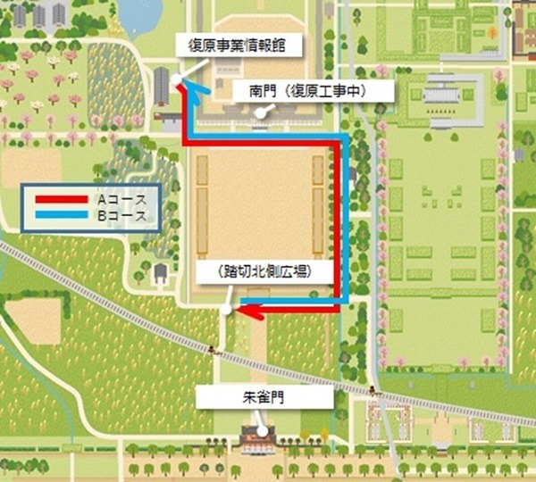 同公園内の踏切北側と「復原事業情報館」に乗降場を設定し、自動運転車による定点間の送迎を行う。特に、踏切北側から復原事業情報館へのルートでは、凸版印刷株式会社が実験実施パートナーとなり、同社が平城遷都1300年事業で製作したVRコンテンツを活用。株式会社ティアフォーの自動運転モビリティ「Milee(マイリー)」に乗りながら、今は見ることのできない当時の姿を再現した高精細で臨場感溢れるVRコンテンツを、ボランティアガイドによる魅力あふれる解説と共に体感できる。