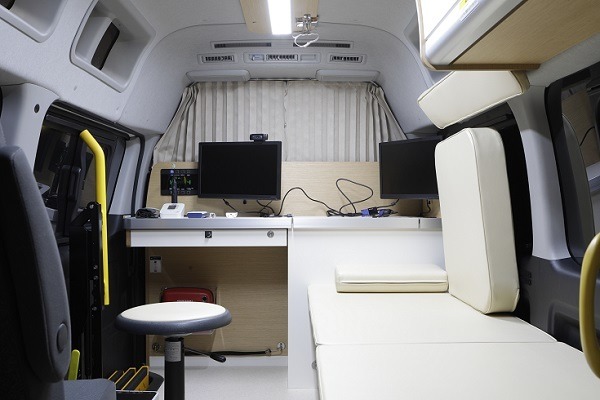 診察 | 心電図モニターや、血糖値測定器、血圧測定器、パルスオキシメーターおよびAEDなどの診察に必要な医療機器を車両に搭載。 |
